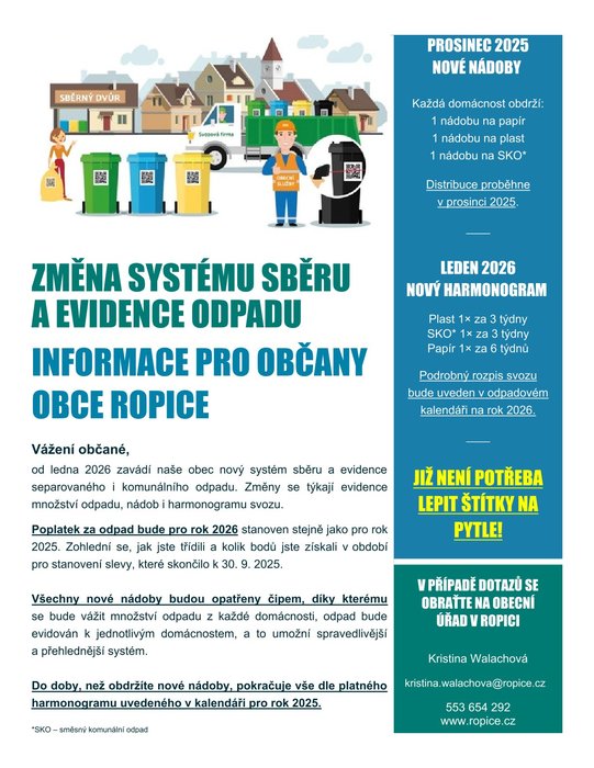 V návaznosti na dlouhodobé zkušenosti a připomínky obyvatel ke svozu a separaci odpadu zavádíme od příštího roku nový systém třídění a svozu. Současný způsob se v praxi ukázal jako ne zcela vyhovující, často docházelo k problémům s pytli, jak s evidencí, tak jejich odnášením větrem a následným nepořádkem. Cílem změny je proto zefektivnit celý systém a přispět k větší čistotě v obci i k lepšímu komfortu pro Vás, její občany.